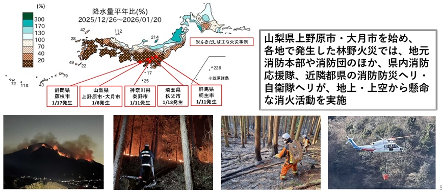 気象庁と消防庁及び林野庁は、1月22日に合同記者会見を開き、東日本太平洋側や西日本では「30年に1度程度の顕著な少雨」になっているため、林野火災予防対策を強化するよう呼びかけた。今後1か月程度は少雨