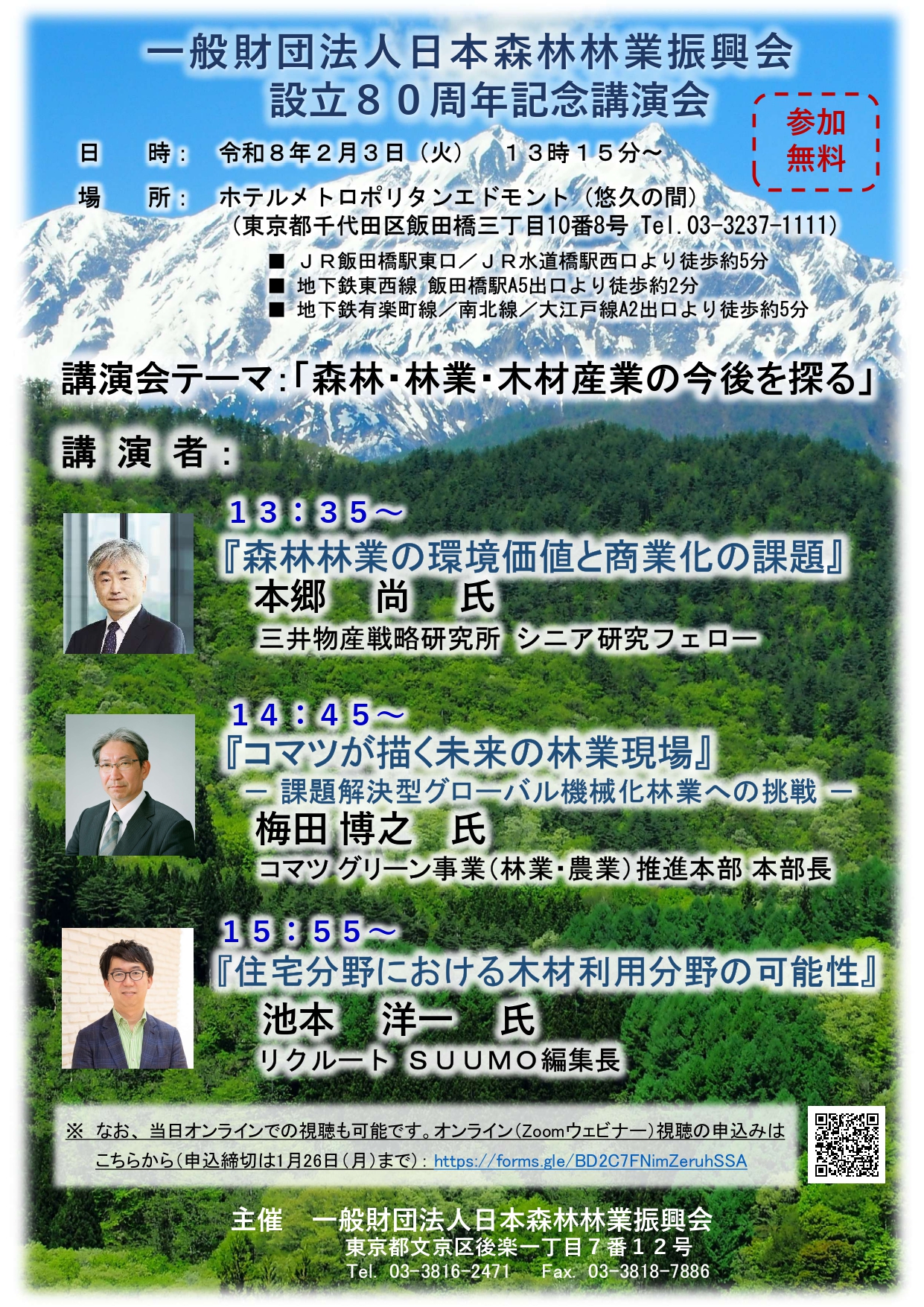 日本森林林業振興会(東京都文京区、沼田正俊会長)は、2月3日(火)午後1時15分から東京都千代田区のホテルメトロポリタンエドモントで、設立80周年記念講演会を開催する。 三井物産戦略研究所シニ