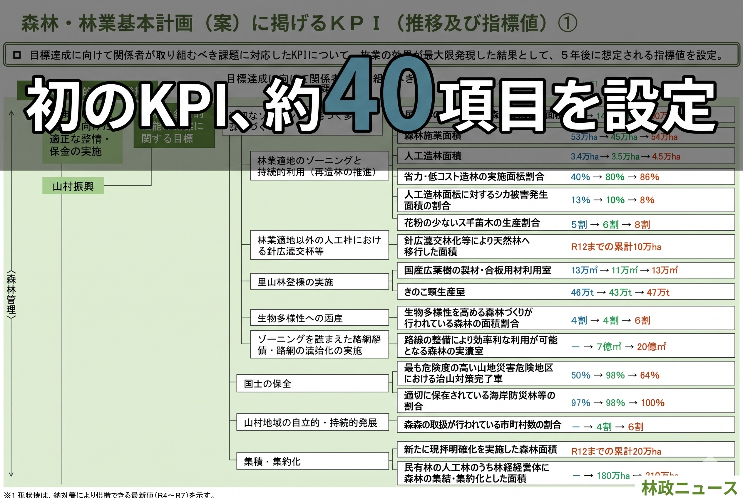 林野庁は、森林・林業・木材産業に関する初のKPI(成果指標)を設定した。6月頃の閣議決定を予定している新しい森林・林業基本計画に盛り込み、林政審議会が進捗状況を検証する仕組みを整える*1。 K