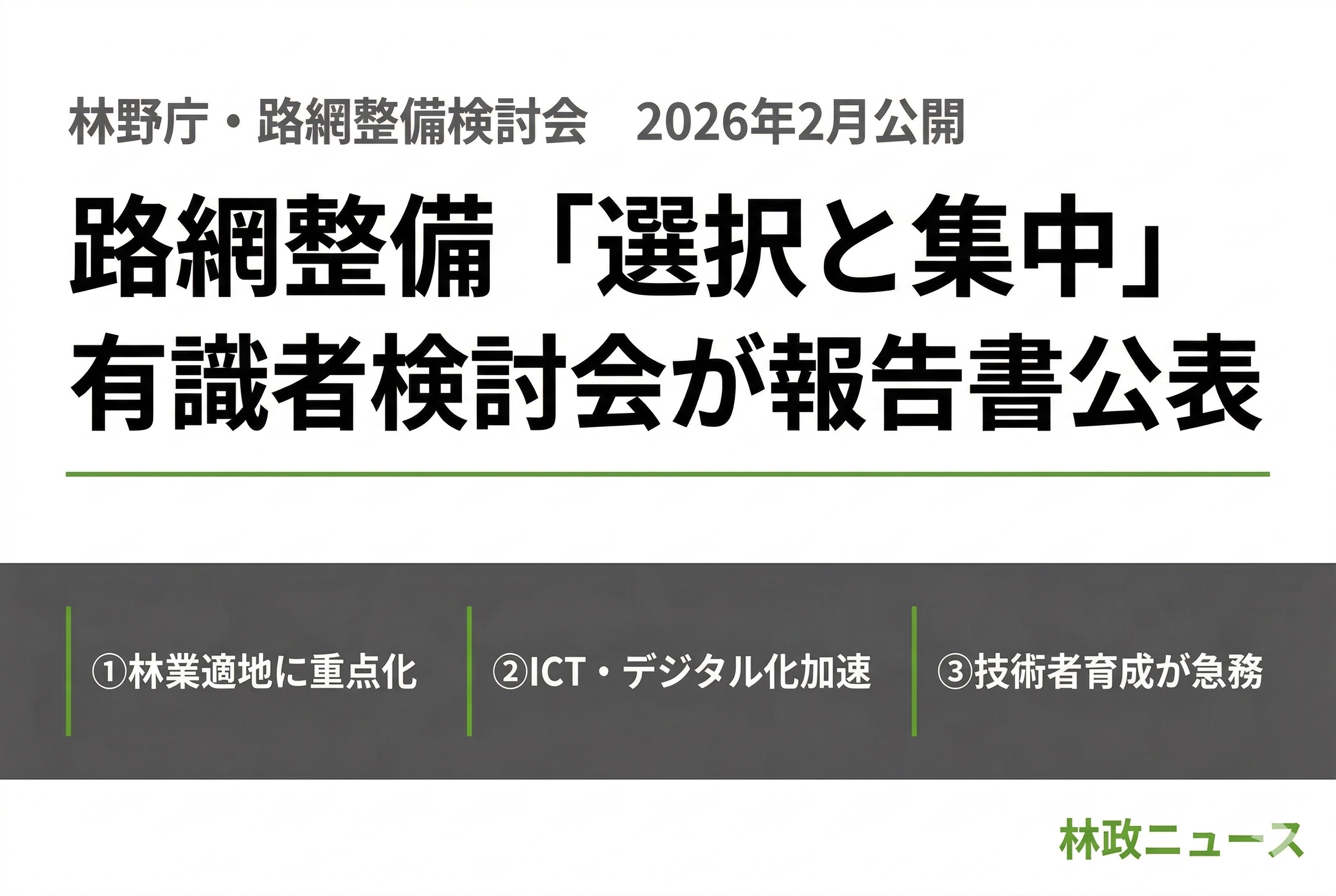 林野庁は、昨年(2025年)6月に設置した「路網整備検討会」(酒井秀夫座長)による議論の成果をまとめた報告書を2月末にウェブサイトで公開した。人口減少などの社会構造の変化を踏まえ、「選択と集中」の考