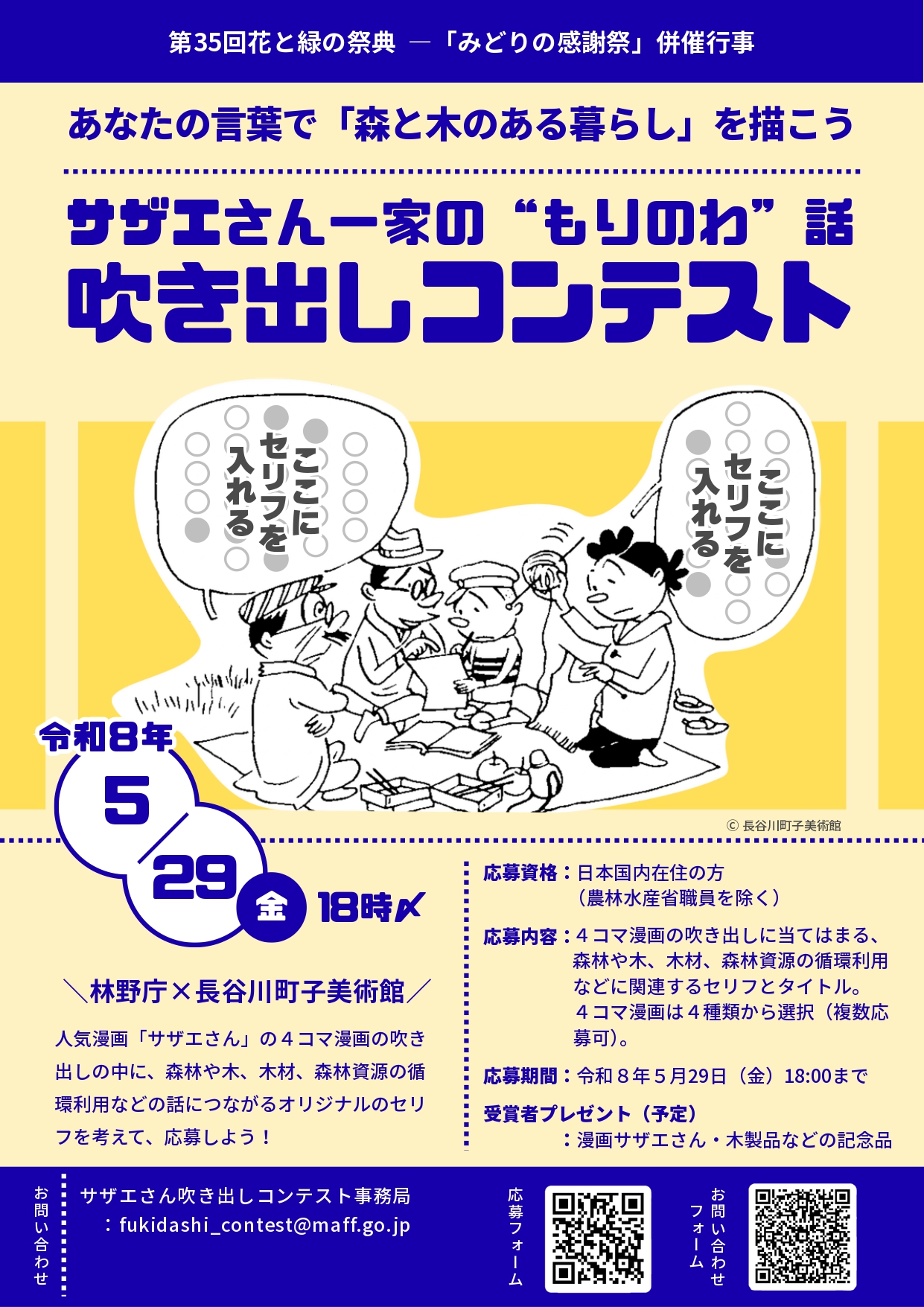 林野庁と長谷川町子美術館は、4回目となる「サザエさん一家の“もりのわ”話」吹き出しコンテスト2026への参加作品を募集している。長谷川町子氏原作の漫画「サザエさん」から選んだ4種類の4コマ漫画の吹き