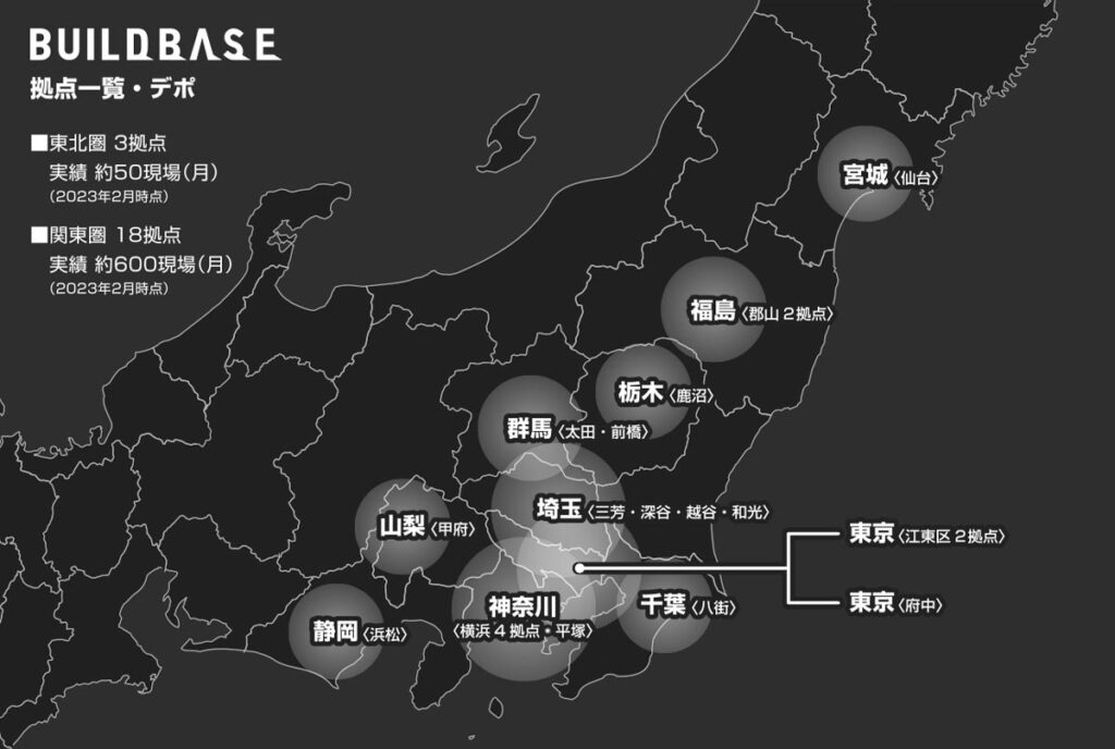 同システムの拠点は、東北圏に3か所、関東圏に18か所あり、各拠点には複数現場向けの必要資材を一括して保管している。月間の利用実績は、東北圏で約50現場、関東圏で約600現場に達している。
