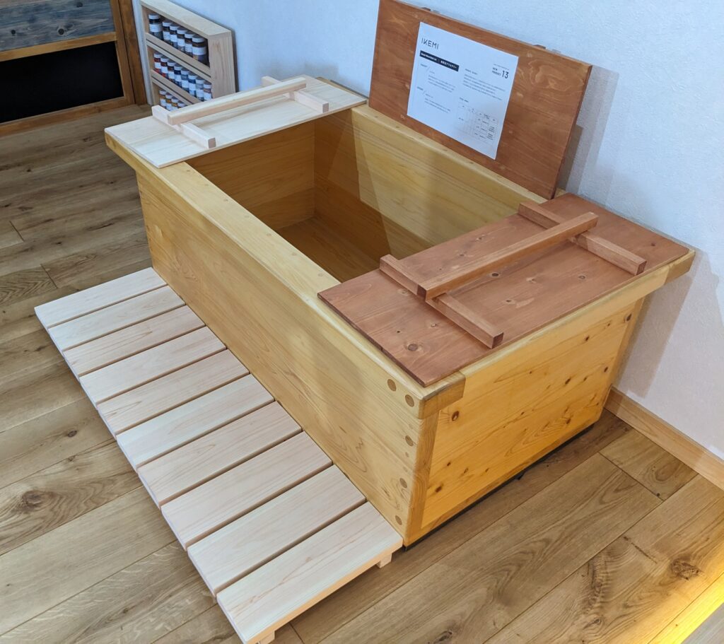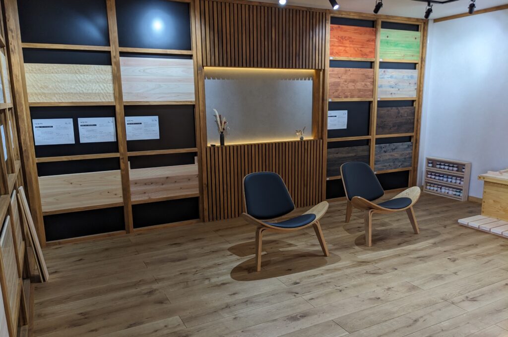 池見林産工業の本社事務所の2階は、同社の製品を紹介するショールームになっている。そこには、「桧舞台」(純木桧ムクフローリング)や「ゆかだん桧舞台」(床暖房に対応した純木桧ムクフローリング)、「杉並木」(壁板・腰壁用材)、「桧風呂」などの代表的な製品とともに、カラフルに色づけされた板材などが展示されている。