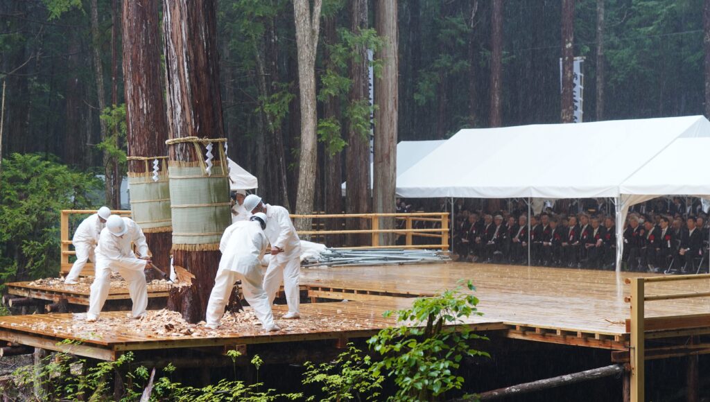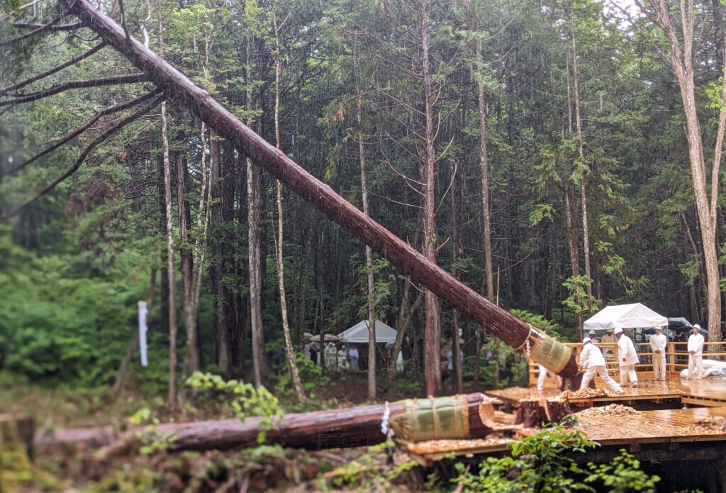 それでも11時半過ぎに「三ツ紐伐り」がスタートすると、空気が変わった。「杣人」は、雨に打たれながらも着実に斧を入れていく。1時間余をかけたハイライトの伐倒時には、参列者の間から歓声が上がり、報道関係者の間からも感嘆と安堵の声が漏れた。