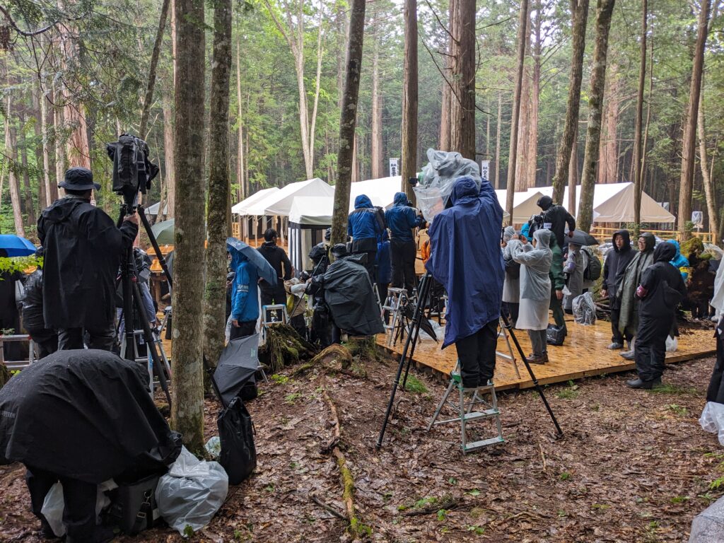 御杣始祭の当日は、朝から雨。その中で、約80人の報道関係者が午前6時過ぎに現地入りし、7時前には取材スペースでの陣取りなどを終えた。ただし、雨よけの天幕などはなく、10時の式典開始まで、降りしきる雨の中でひたすら待つのみ。