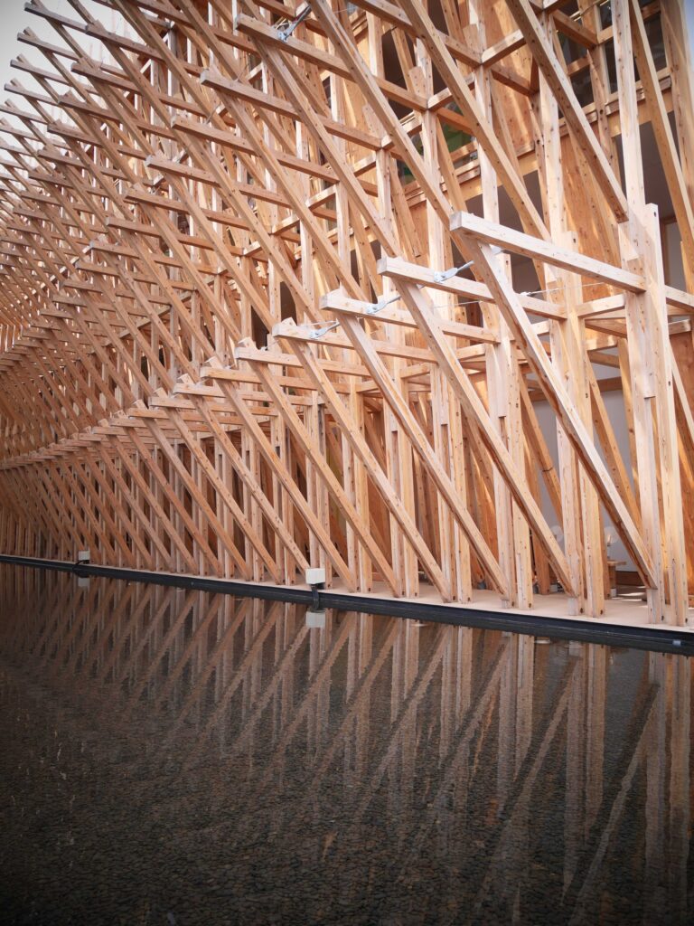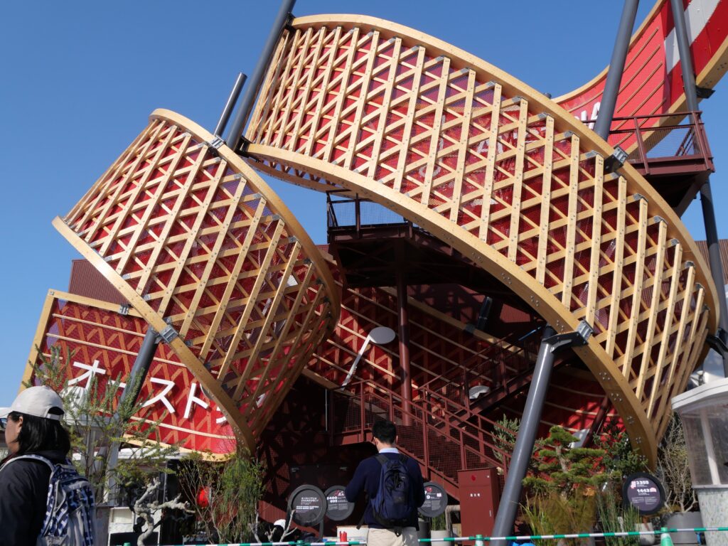 驚かされたのはイタリアのパビリオンで、鉄骨に木材を取り付けた構造だと思っていたら、純粋な木造3階建てだった。内部は木材の構造がそのまま見える設計となっており、筋交いや、柱と梁をつなぐ火打材までも意匠として堂々と露出されている。
