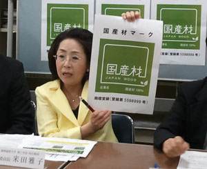 (トップ画像=国産材マークを掲げる米田雅子・JAPIC森林再生事業化委員会委員長)