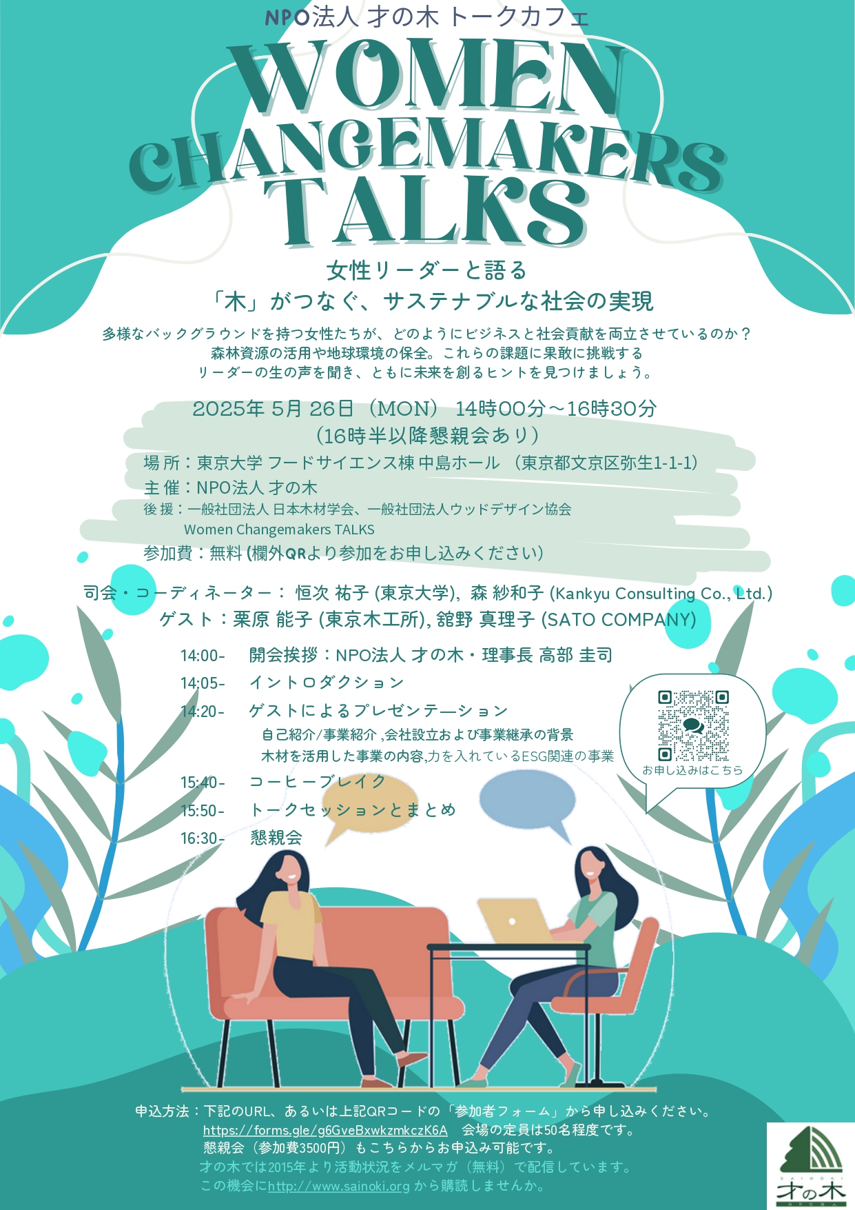 NPO法人才の木は、5月26日(月)午後2時から東京都文京区の東京大学フードサイエンス棟中島ホールでWOMEN CHANGEMAKERS TALKS「女性リーダーと語る『木』がつなぐ、サステナブルな