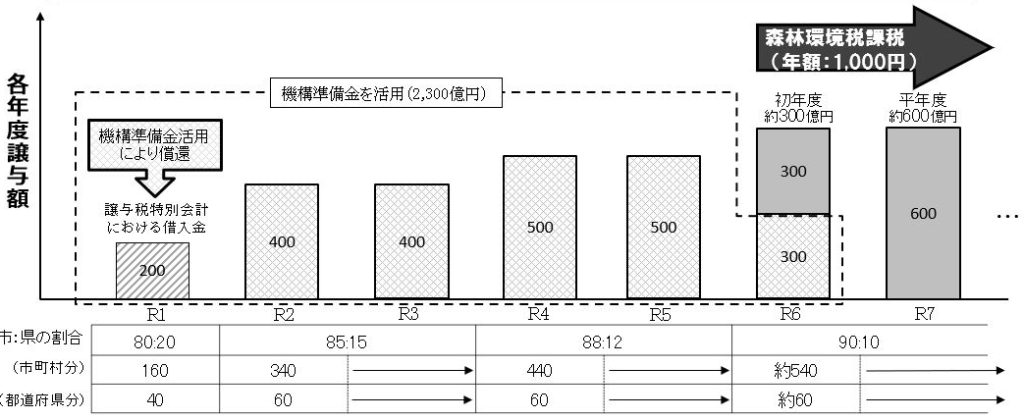 当初の計画では今年度以降の譲与税交付額は600億円で安定することになっていたが、実際に徴税(1人年額1,000円)をしてみると税収が上振れしており、昨年度は602億円を交付し、今年度は689億円に交付額がアップする見込みとなっている。