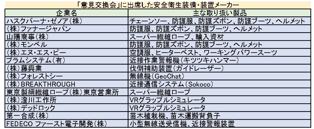 林業現場の安全性をいかに向上させるか、全国の関係者が“決定打”を探し求めている中で、従来にない切り口の会合が7月22日に東京都内で開かれた。それは、林野庁が行った「安全衛生装備・装置メーカーとの意見交換会」。現場で働く人々が身に着ける防護服やヘルメットなどのメーカーが集まり、使用者からの要望や注文を踏まえて改良点などを考える場が初めて設定された。なかなか興味深い内容だったので、エッセンスをお伝えしよう。