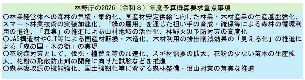 林野庁の来年度(2026(令和8)年度)予算要求に盛り込む重点事項が固まった。小泉農相が打ち出した新方針*1を踏まえて、「『森の国・木の街』の実現に向けた森林資源循環利用施策の総合的な展開」(仮称)をテーマに、各種事業等に必要な財源の確保を目指す。