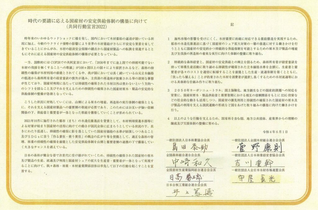 ウッドショックに加えて、ロシア・ウクライナ情勢等による貿易環境の不透明さなどがあり、経済安全保障の観点からも国内の森林資源を持続的に利用することが国家的な課題になっている。外材製品から国産材製品への転換を促進することが必要であり、それを可能にする国産材の増産、安定供給体制を早急に整備しなければならない。こうした問題意識は、林業・木材産業に関わる中央団体の間でも共通しており、代表的な7団体で「宣言」を出し、自ら課題解決に取り組んでいくことにした。
