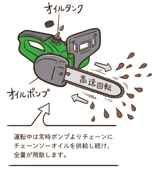 チェーンソーやハーベスタを円滑に効率よく動かすためには、チェーンオイルが欠かせない。国内では、1日にチェーンソーで約1.2ℓ、ハーベスタで2.5~6ℓ程度のチェーンオイルが使われ、林内の土壌に散布されているとみられている。