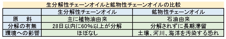 これまでは石油由来の鉱物性チェーンオイルが当たり前のように使われてきた。だが、鉱物性チェーンオイルは、1ℓで100万ℓ分の水を汚染するとの試算値もあり、欧州では微生物によって分解される「生分解性チェーンオイル」を使うことが主流になっている。世界的に生物多様性保全に配慮した森林施業の実践が求められる時代に入り、日本もチェーンオイルを環境にやさしいタイプに切り替えていく必要性が出てきている。