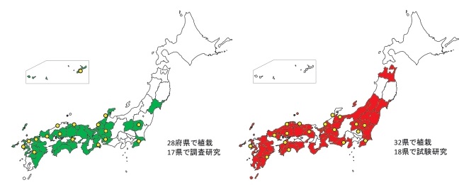 この6年半で早生樹への関心は着実に高まっており、植栽地も広がってきている(図参照)。その中で登壇者が一様に言及したのは、早生樹は“万能薬”ではなく、適地適木を原則として、樹種の特性を踏まえた育て方をする必要があること。この点は、第1回シンポジウムでも指摘されていたが、今回も「早生樹は生育場所を選ぶ」(杉山氏)、「立地条件の違いをよく見る必要がある」(藤井氏)などの発言が目立った。