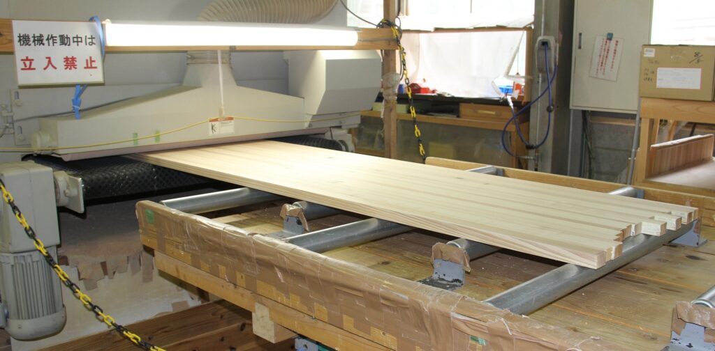 ここから車で20分ほどの山崎工場で行っている。白肌のムクの良質材はそのまま使い、節がある場合はそれを除いて、様々なサイズのフリー板に仕上げて販売している。