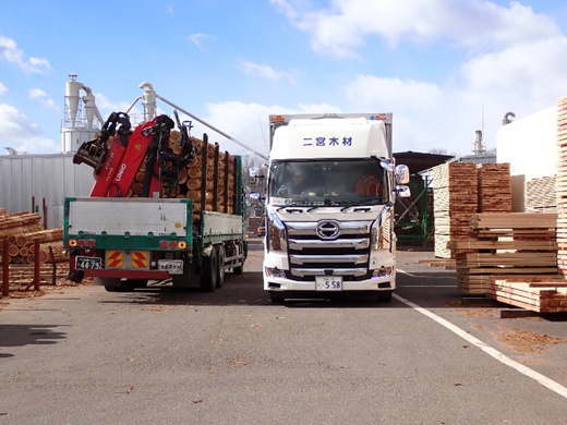 原木の輸送については、原木市売市場で購入したものは自社のトラックで行い、素材生産業者は自己所有のトラック等で直接持ち込んでくる。木材製品の配送計画は取締役専務の二ノ宮泰爾氏が担い、原木の配送計画は代表取締役の二ノ宮次郎氏が担当し、業務分担を行うことで情報の集約や共有に伴う混乱を避けるようにしている。