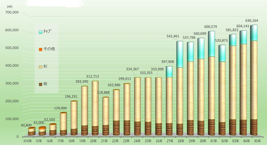 同社の年間原木取扱量は、2022年、2023年と2年連続で60万m³を上回って過去最高を記録し、全国屈指の事業規模を誇っている。