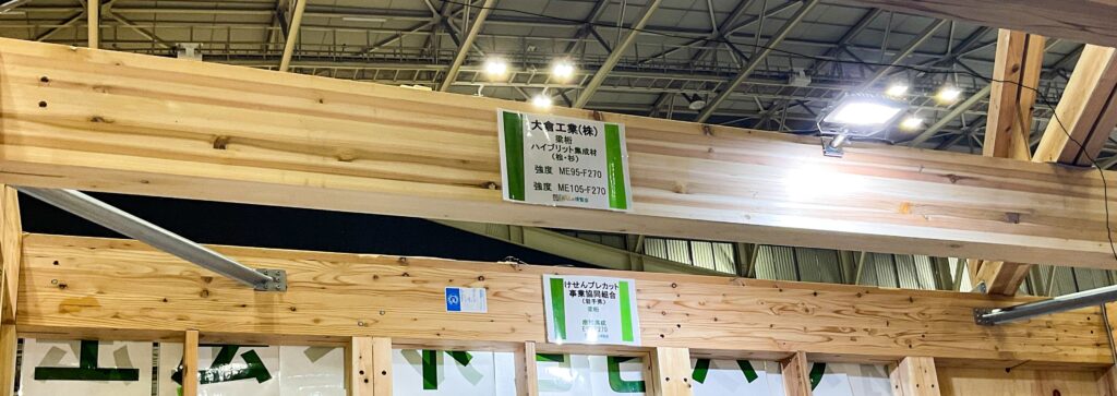 同コーナーの一角には大倉工業(株)(香川県丸亀市)との協業で開発したスギ・ヒノキのハイブリッド集成材(横架材)のサンプルも展示した。ハイブリッド集成材の材料となる板材(ラミナ)を製造する工場は今年(2025年)4月24日に竣工式を行っており、製品供給に向けて大倉工業サイドの新工場竣工と本格稼働を待つ段階になっている。