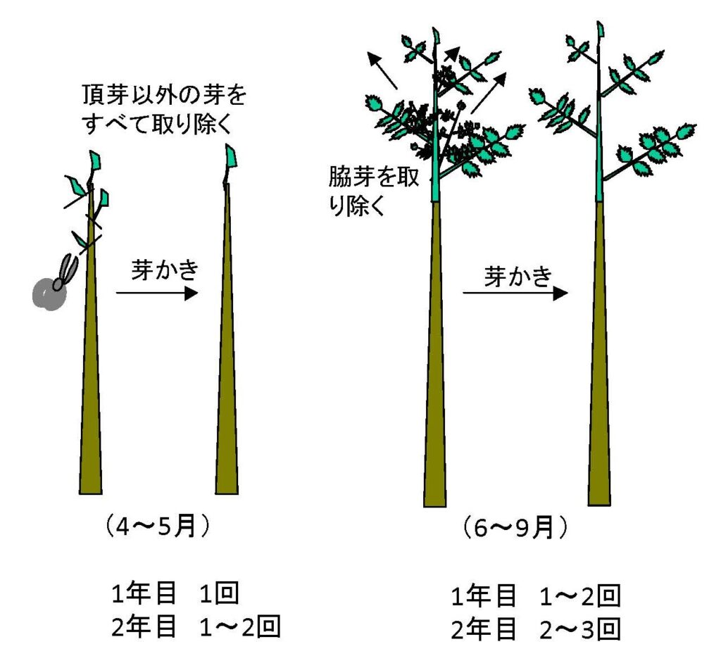 芽かきは、頂芽以外の脇芽をすべて取り除く作業で、頂芽が出芽しない場合は、最も高い位置の脇芽だけを残して、他の脇芽を除去する。栄養を樹木の最上部に集中させることで、樹形が通直になる。