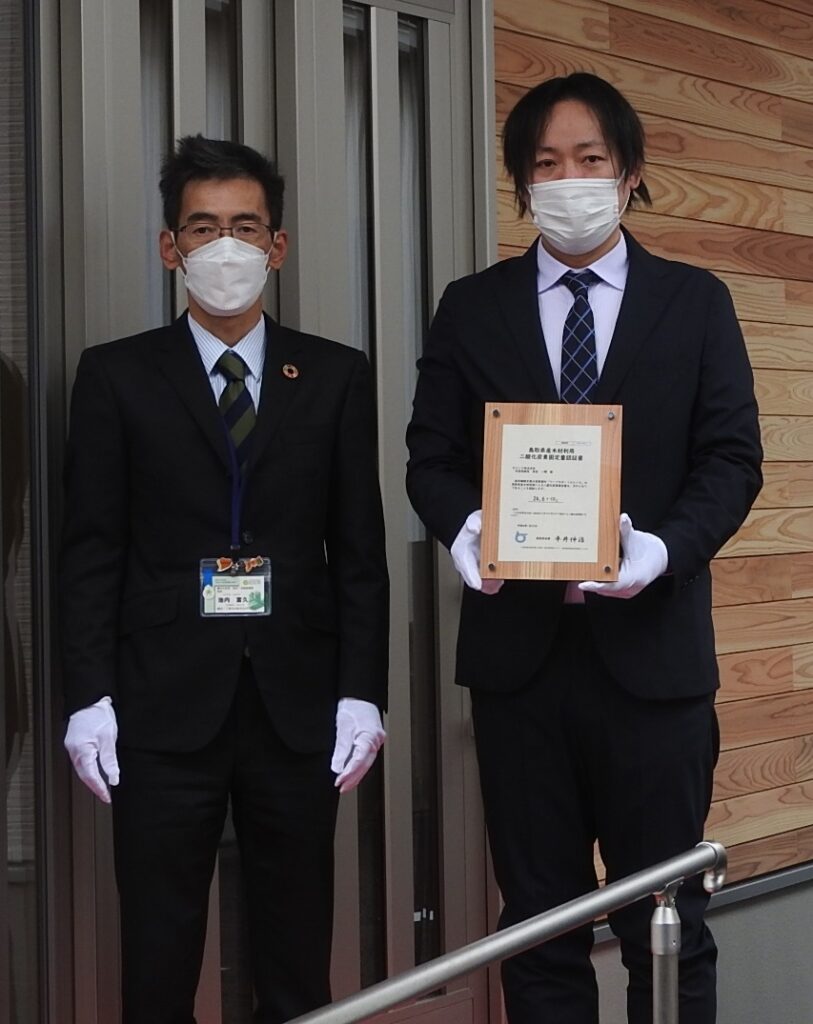 1月22日に認証授与式を行うとともに、設計・施工を担当した(株)ヤマタホーム(鳥取市)が22日から24日まで完成見学会を開いて、一般消費者らが木造建築物を体感できる機会をつくった。
