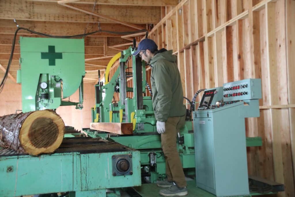 「木挽ラボ」は、北軽井沢に本社を置く(有)きたもっく(福嶋誠社長)が運営し、年間800~1,000m3の原木を製材する。長野県の木材機械業者が仲介し、山形県の中古木材機械業者が修理・整備した直径1m10cmまで挽けるシングルの帯鋸製材機を導入した。