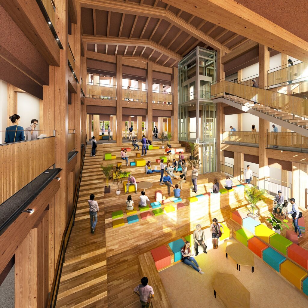 立命館は、2023年度に別府市にある立命館アジア太平洋大学内に新学部「サステナビリティ観光学部」(仮称)を開設する準備を進めている。これに伴い、新たに建設する教学棟(延床面積6495.95m2)の一部(中央部分)を木造(同1,400m2)にすることを計画しており、実現すれば同県内の3階建て校舎では初の木造準耐火建築物となる。製材や集成材などの木材使用量は450m3に及び、大部分(430m3)が同県産材となる見込みだ。