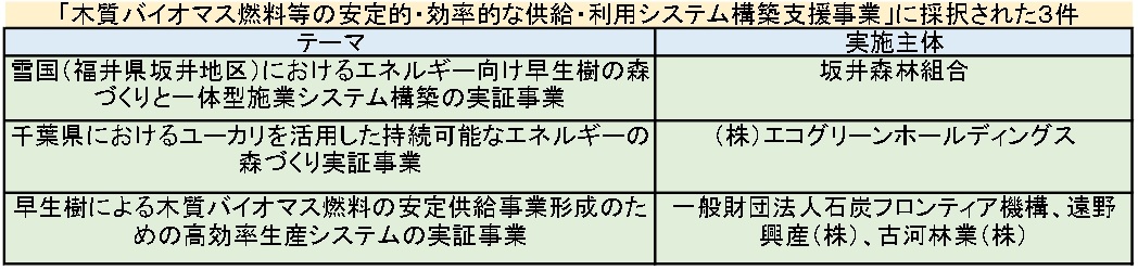 第1弾として採択された3件は、それぞれタイプが異なる(トップ画像参照)。福井県の坂井森林組合は寒冷地で早生樹を育成し、(株)エコグリーンホールディングスは千葉県でユーカリを活用、石炭フロンティア機構(東京都港区)・遠野興産(株)(福島県いわき市)、古河林業(株)(東京都千代田区)は早生樹由来の燃料を安定的に利用するシステムづくりを目指す。