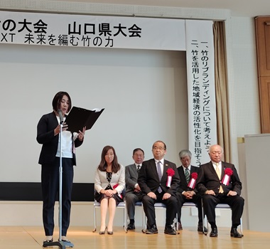 1日目は、ときわ湖水ホールで式典やシンポジウムなどを行った。冒頭に挨拶した山﨑会長は、山口県が立ち上げた「YAMAGUCHI Bamboo Mission(やまぐちバンブーミッション)」の活動が充実していることなどを先進事例としてあげ、「本大会がきっかけとなって竹産業がもう一度儲かる産業になることを願っている」と強調した。
