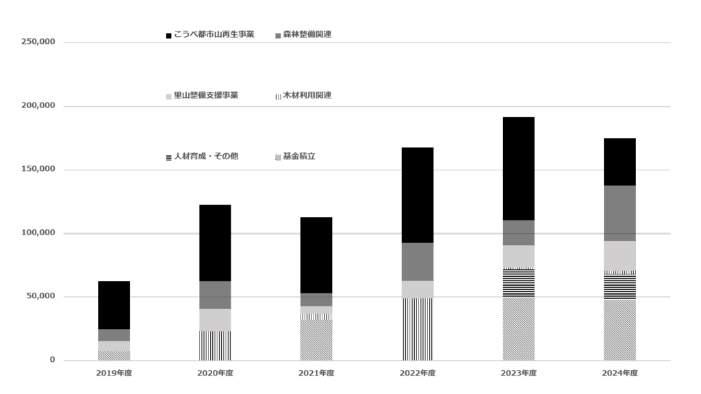 このほか、「里山整備支援事業」では、竹林・雑木林などの手入れや獣害対策に取り組む地元団体に活動費等を助成し、林地台帳や森林GISなどの整備・更新等も行っている。さらに、様々なプレイヤーが参画する「こうべ森と木のプラットフォーム」の運営費にも充当している。