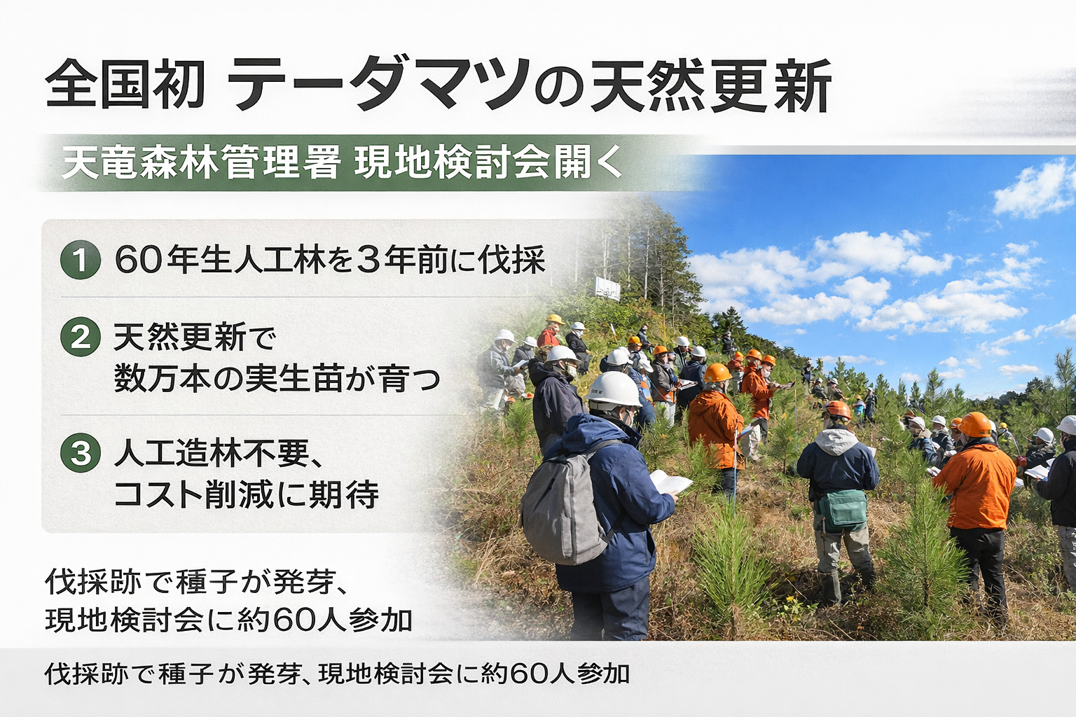 なお、天竜森林管理署(静岡県浜松市)は、テーダマツが大半を占める林分の入札を10月29日に初めて実施した。同林分は、立木本数が1,105本で、テーダマツが934本と約85%を占め、ほかはスギ、ヒノキ、広葉樹となっている(総材積は1815.28m3)。3社が応札し、西山林業合同会社(愛知県新城市)が482万円(税抜き)で落札、1m3当たりの平均価格は約2,655円だった。