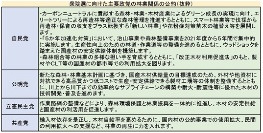 林野庁も補正予算の検討作業に着手しており、主要政党が打ち出した政権公約(トップ画像参照)における林業関係の政策課題などを踏まえながら、重点事業などの内容を詰めていくことにしている。