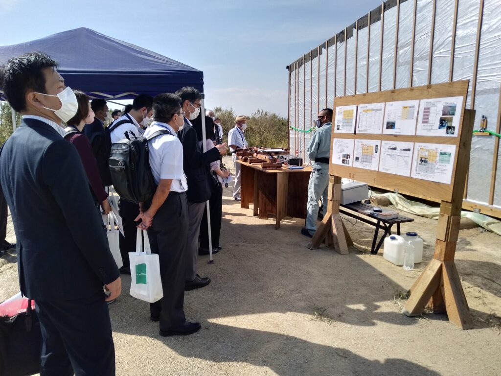 同研究会は、大阪・関西万博パビリオンで同工法が採用されることを当面の重点目標に位置づけており、夢洲エリアに試験棟をつくり、実大実証試験を行っている(林野庁補助事業を活用)。見学会には約40名の関係者が参加し、「木製の基礎がRCに比べてすぐれていることがわかった」、「SDGsの理念にマッチしている」などの感想が聞かれた。