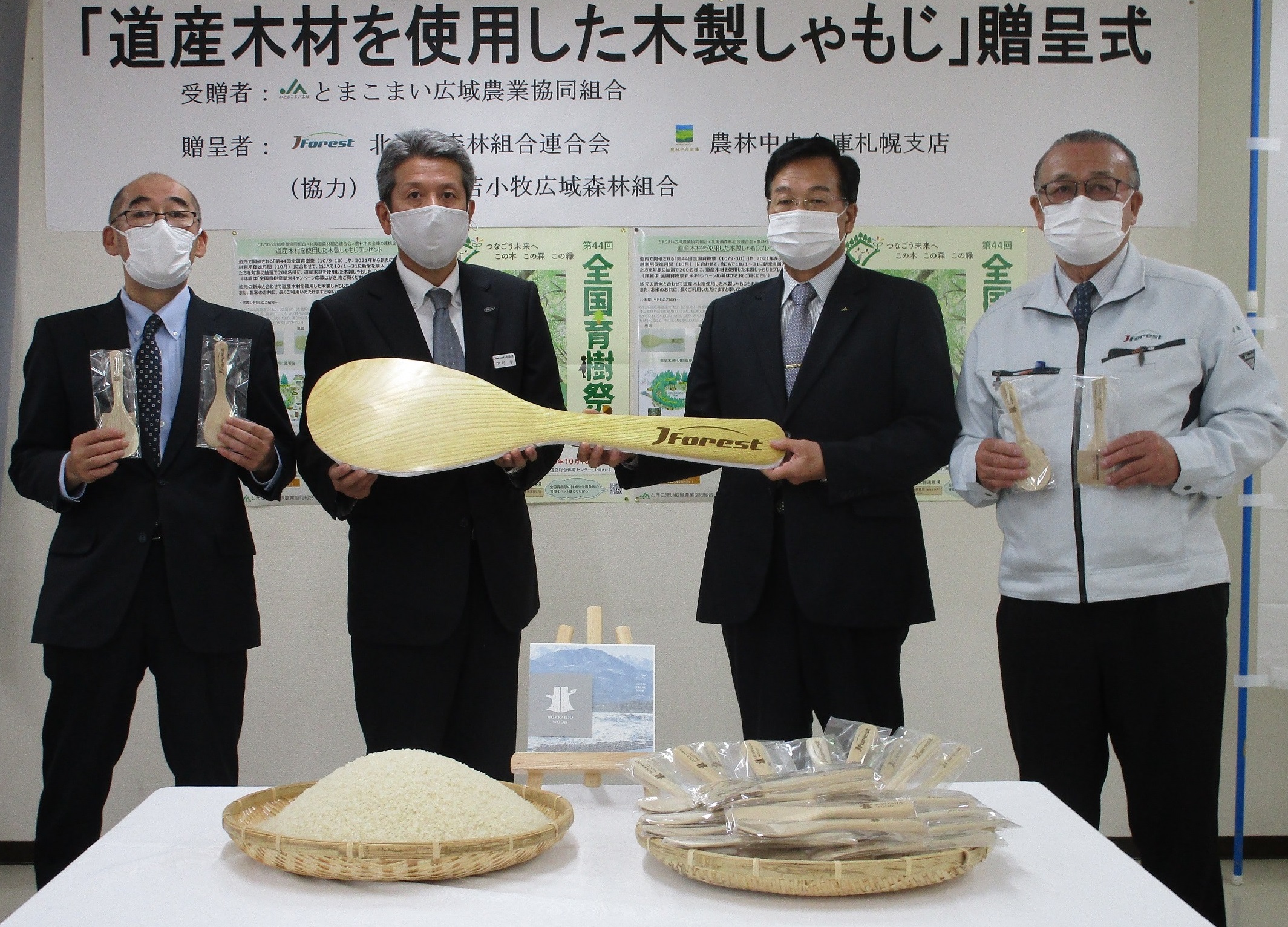 (トップ画像=10月1日にJAとまこまい広域で「木製しゃもじ」の贈呈式を行った)