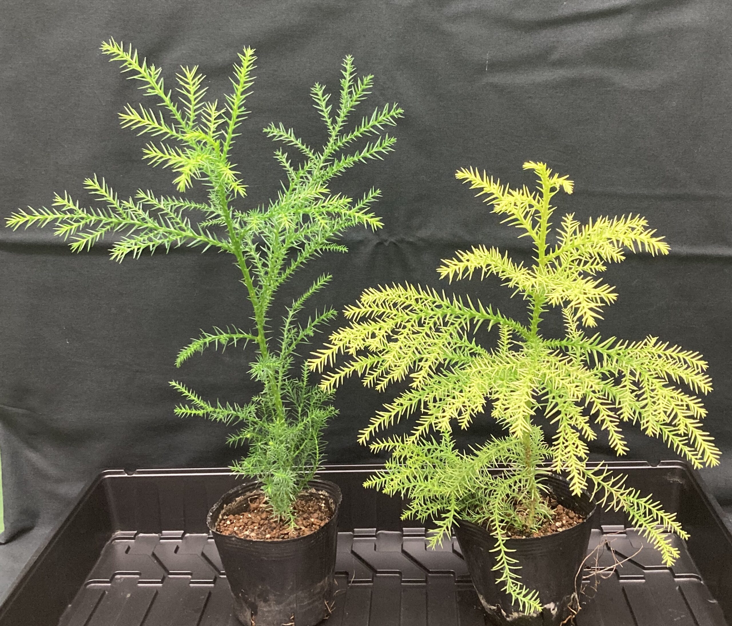(トップ画像=野生型のスギ個体(左)とゲノム編集により黄緑になった個体)