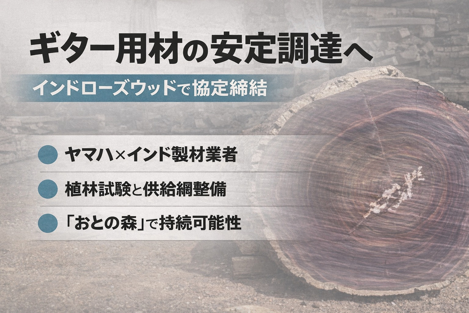 総合楽器メーカーのヤマハ(株)(静岡県浜松市、山浦敦社長)は、ギターに使用するインドローズウッドを安定して調達するため、インドの製材業者「オーバーシーズ・トレーダーズ(Overseas Traders)」との間で連携協定を締結した(11月20日に発表)。