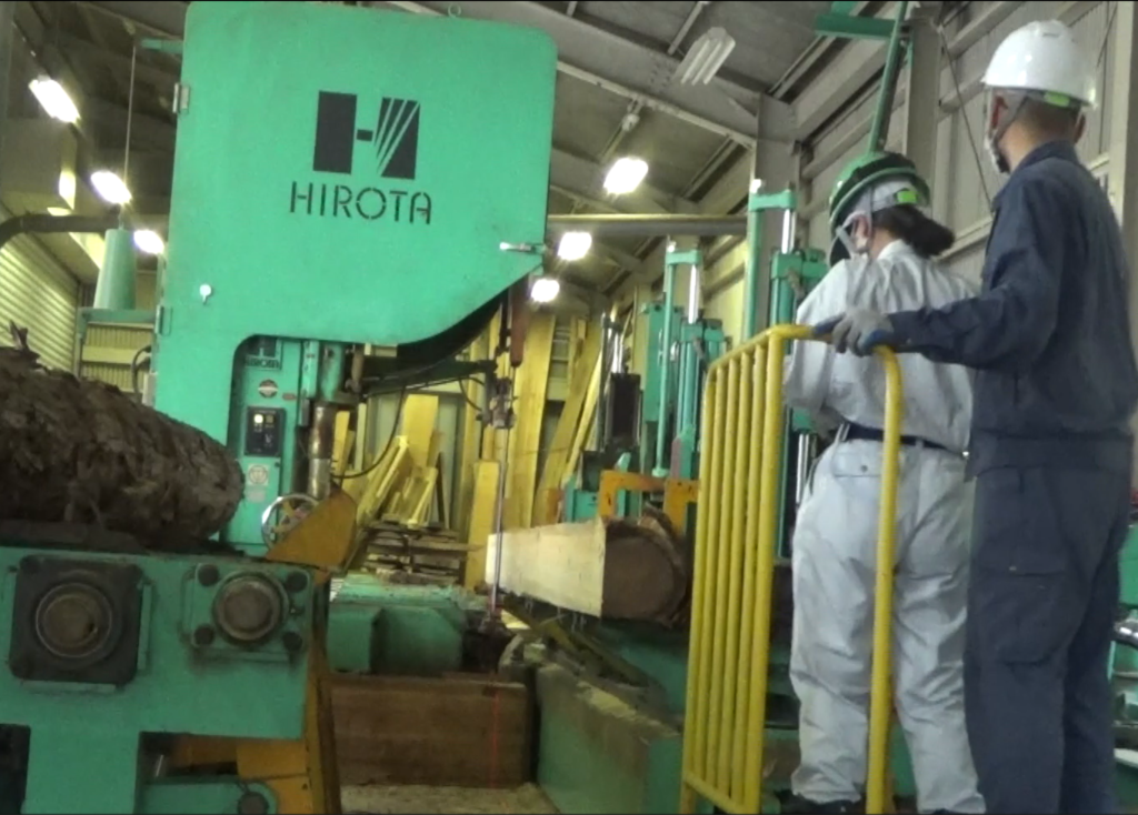 同校には、全国的にも珍しい帯鋸製材機があり、一部のコースでは木取りを含めて木材加工技術を学んでいる。