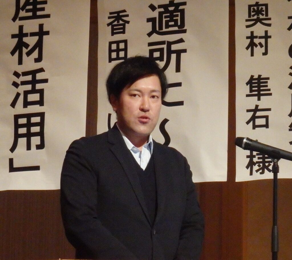 カリモク家具(株)(愛知県東浦町)の取締役副社長・加藤洋氏は、「国産材は、私たちの業界でも注目を浴びている」と述べた上で、2009年から進めている新製品開発プロジェクトの進捗状況などを解説した。