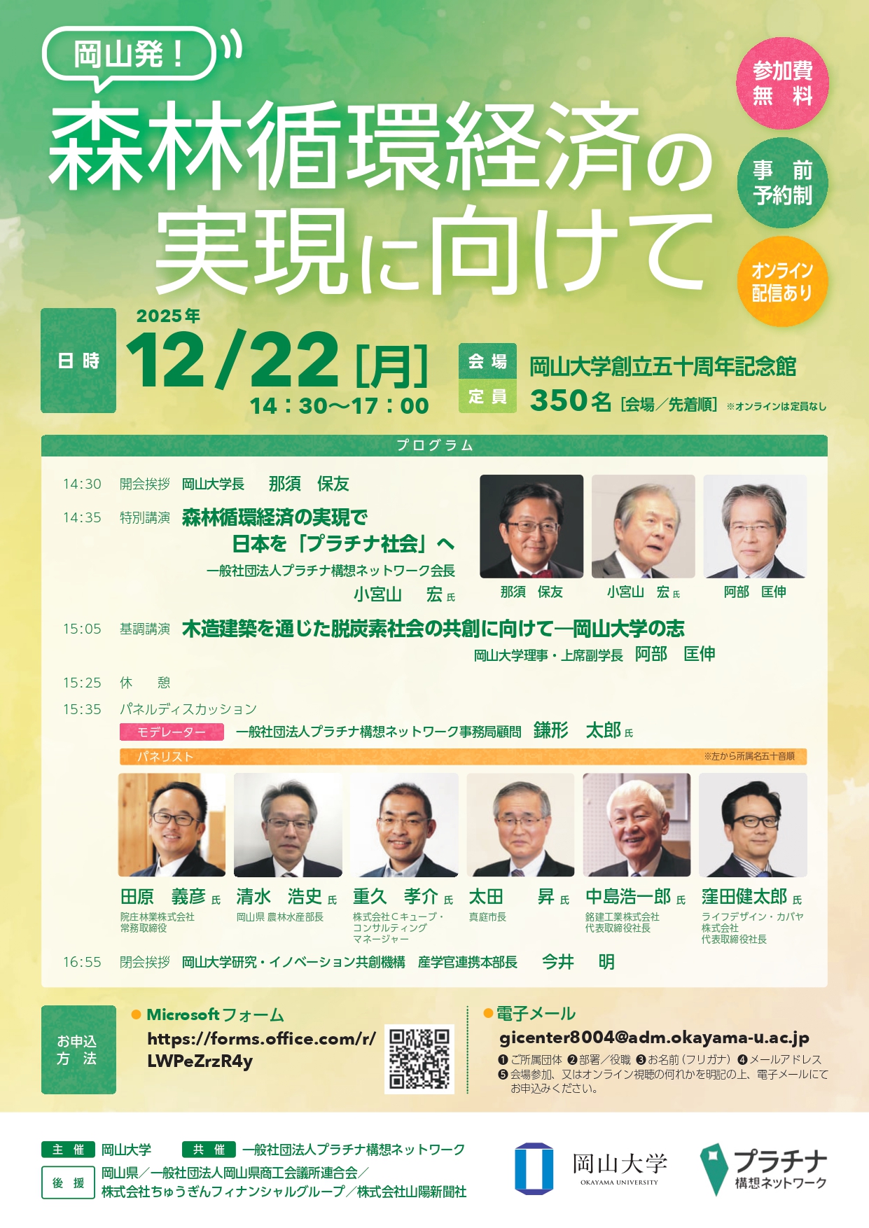 岡山大学とプラチナ構想ネットワークは、12月22日(月)午後2時30分から岡山市の同大学創立五十周年記念館金光ホールで、公開シンポジウム「岡山発、森林循環経済の実現に向けて」を開催し、ライブ配信も行う。同大学理事・上席副学長の阿部匡伸氏が基調講演し、パネルディスカッションを行う。定員350名(先着順)。参加費無料。→詳しくは、こちら
