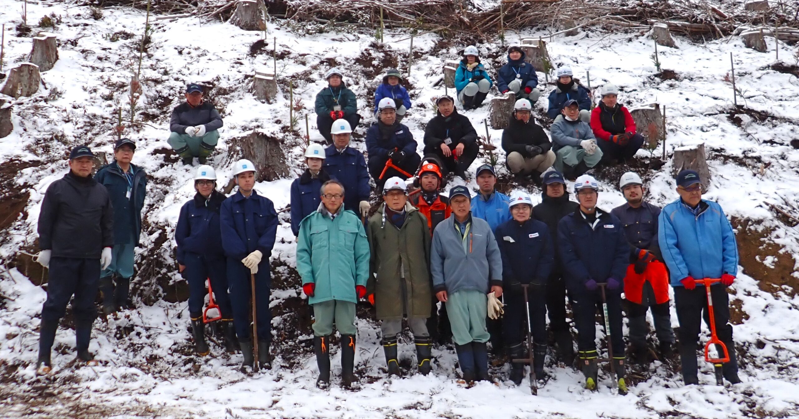 協定関係者をはじめ取り組みに賛同するBXカネシン(株)(東京都葛飾区、夏目正来社長)や「宮城の伊達な杉の家を創る会」のメンバーら約30名が参加し、0.30haの皆伐跡地に少花粉スギのコンテナ苗を600本植栽した。