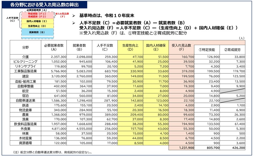 外国人材の受け入れ上限数は、産業分野ごとの必要就業者数や人手不足数、生産性の向上などを勘案して算出されている。