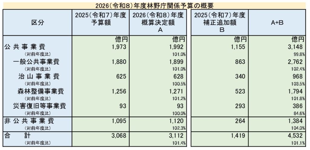 林野庁関係の概算決定額は3,112億円で、今年度(2025(令和7)年度)当初予算比で1.4%増加した。12月16日に成立した今年度補正予算*1の1,419億円を加えた総額では対前年度比1.1%増の4,532億円となり、前年度並みの財源をキープした(表参照)。