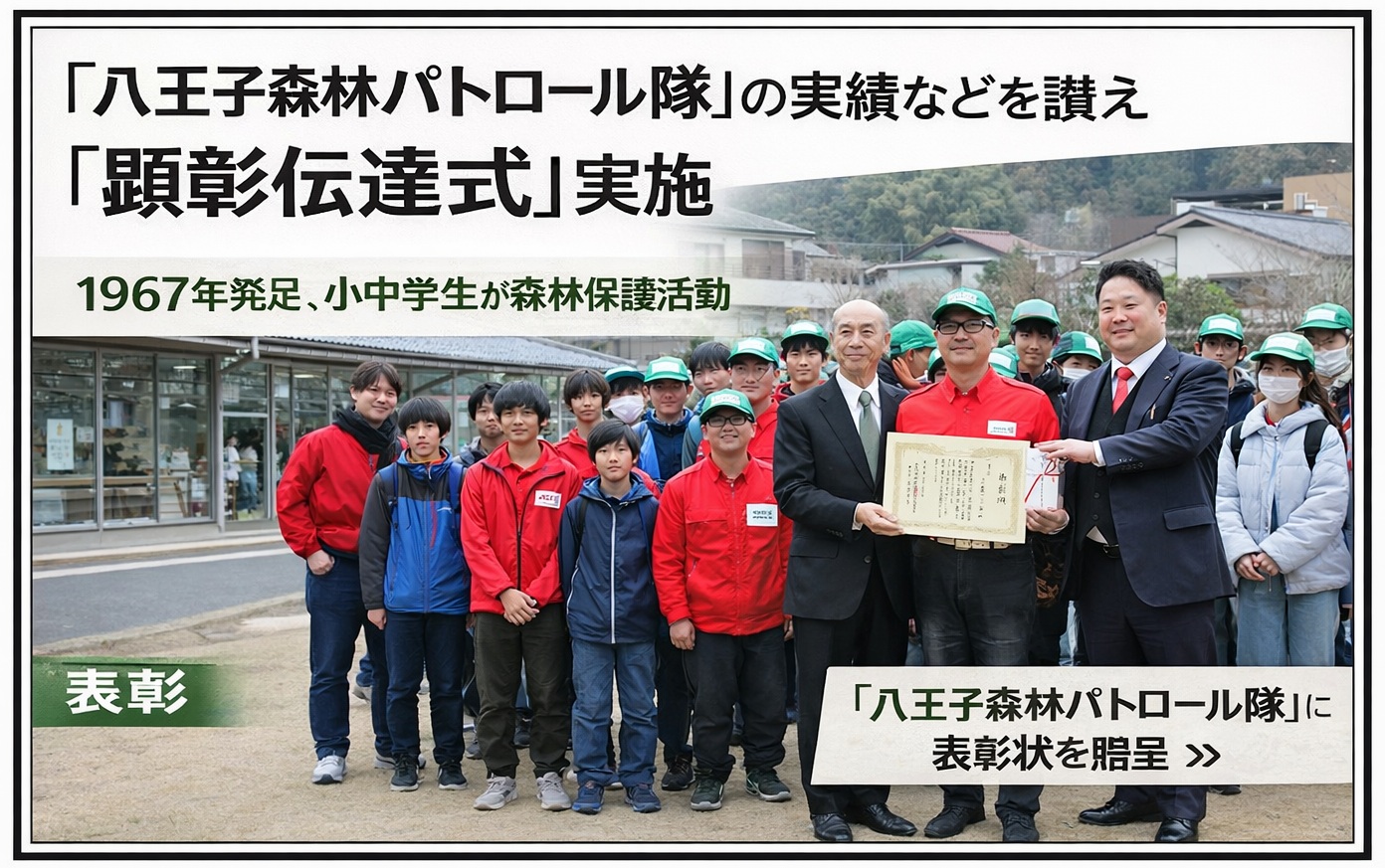 伝達式には、八王子森林パトロール隊の隊員と川上雅教隊長をはじめ八王子青年会議所の白柳広賢理事長らが出席し、東京都農林水産振興財団の佐藤晶春都行造林係長の司会のもと、同財団の前田理事長から表彰状及び副賞が贈られた。