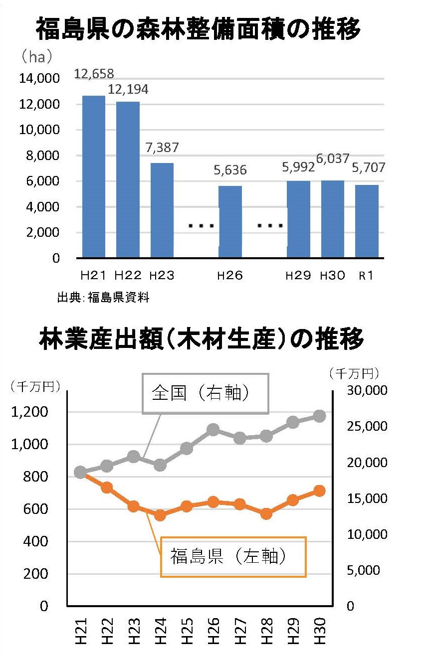 同県の森林整備面積は、震災前の1万2,658ha(2009年時点)から2019年には5,707haへとほぼ半減しており、林業産出額も伸び悩んでいる(トップ画像参照)。