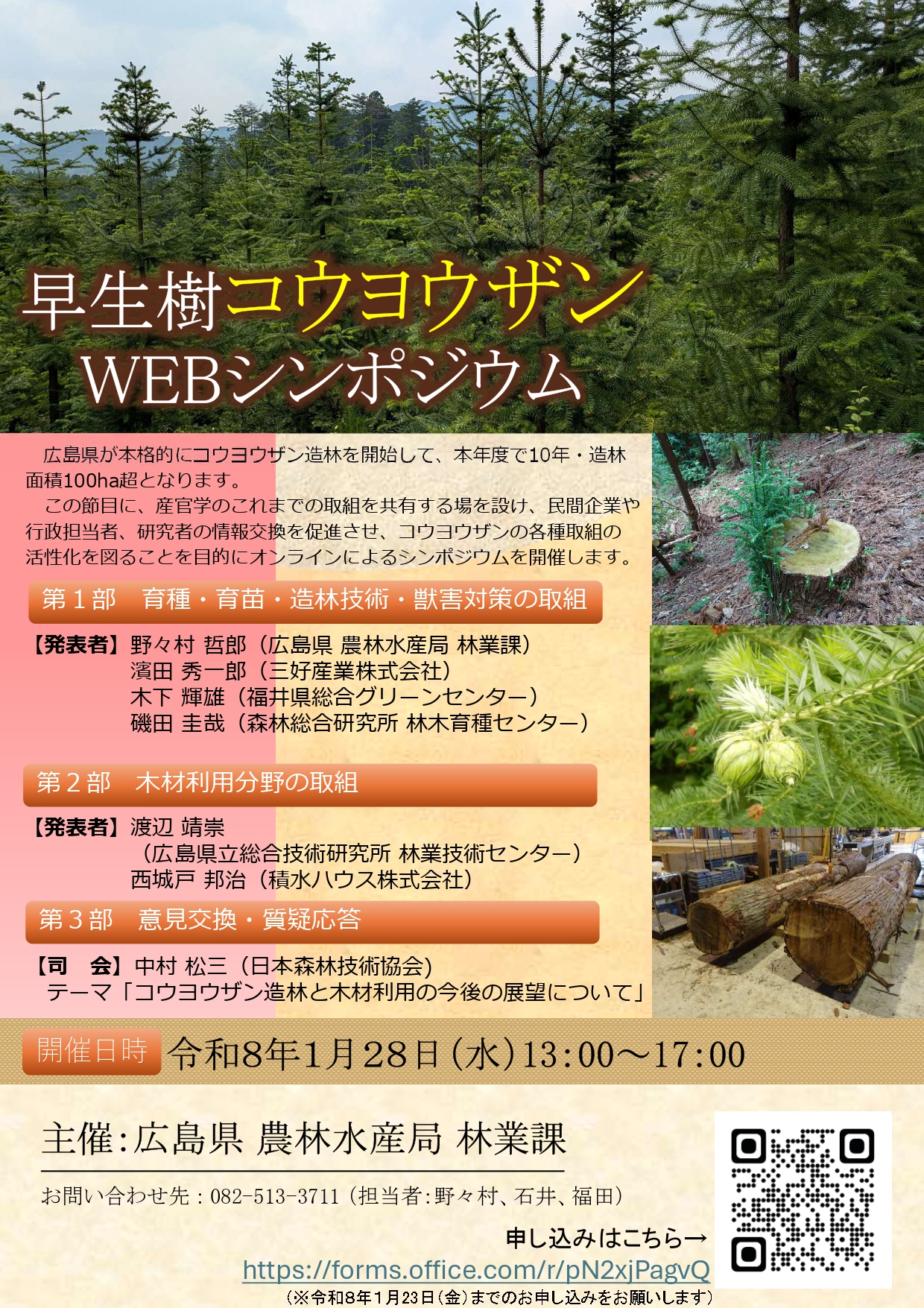 広島県は、1月28日(水)午後1時から「早生樹コウヨウザンWEBシンポジウム」を開催する。同県では、2016年に全国に先駆けてコウヨウザンの造林を本格的に開始して今年10年の節目を迎えており、植栽面積は2024年までで100haを超えている。その実績を踏まえて、育種・育苗・造林技術・獣害対策と木材利用の両面からコウヨウザンの可能性を考える。申し込み締め切りは、1月23日(金)。→詳しくは、こちら