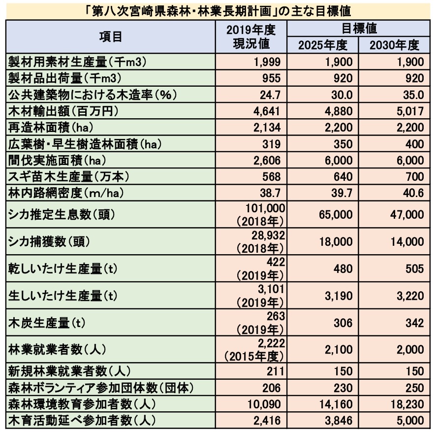 スギ素材生産量日本一の宮崎県は、来年度(2021年度)から10年間を期間とする「第八次宮崎県森林・林業長期計画」をまとめた。同県が作成した素案について、同県森林審議会(会長=中尾登志雄・宮崎大学名誉教授)が12月の審議会で適切であると認め、2月4日に答申、2月議会で正式決定し、来年度から実行段階に入る。