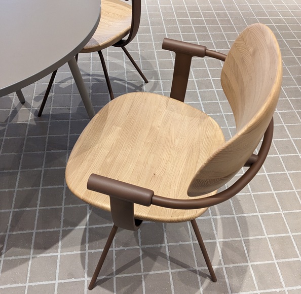 製品開発では、2020年にクリ材を天板に使った大型テーブル「シルタ」を発売し、同年のウッドデザイン賞で経済産業大臣賞(木製品分野)を受賞。2023年と2024年に発売したワークチェア(作業用椅子)「vetebra03 WOOD」と「クロッサWOOD」ではクリ材を背と座の部分に採用した。この間、針葉樹に適した乾燥方法と反り・割れ・ねじれの克服に向けた技術開発を進め、クリ材については3次元形状の成型合板に加工する技術を確立した。