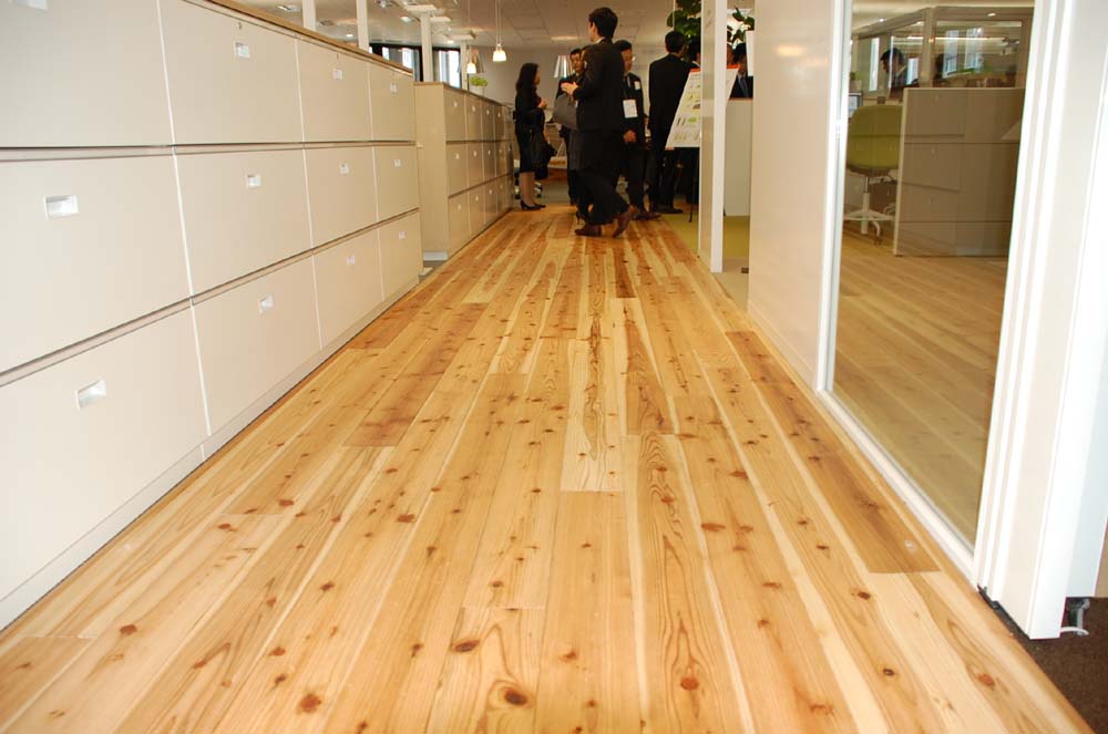 オフィススペースに120mのスギムク材「回廊」、健康への影響も調べる