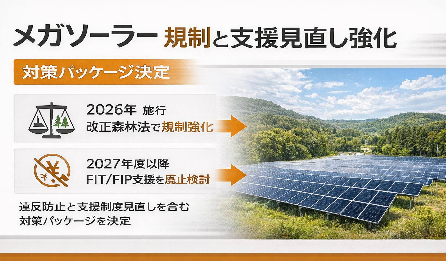 政府は、メガソーラー問題の解決に向けて昨年(2025年)末に「対策パッケージ」*1を決定し、改正森林法の4月施行に併せて、林地開発許可基準を見直すことを当面の課題に位置づけた。