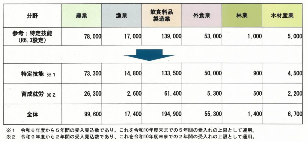 林業の受け入れ枠は、育成就労の500人と特定技能の900人で計1,400人、木材産業は育成就労の2,200人と特定技能の4,500人で計6,700人に設定した*1。木材産業については、今の技能実習の対象職種である「木材加工」に「合板、集成材等」を加える。